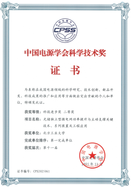 由公司作为第一完成单位,周京华教授、张卫平教授共同牵头完成的项目“光储独立型微电网功率提升与主动支撑关键技术、系列装置及工程应用”,获得“中国电源学会科技进步奖(技术开发类)”二等奖。第十一届中国电源学会科学技术奖共评选出项目类一等奖4项、二等奖13项。